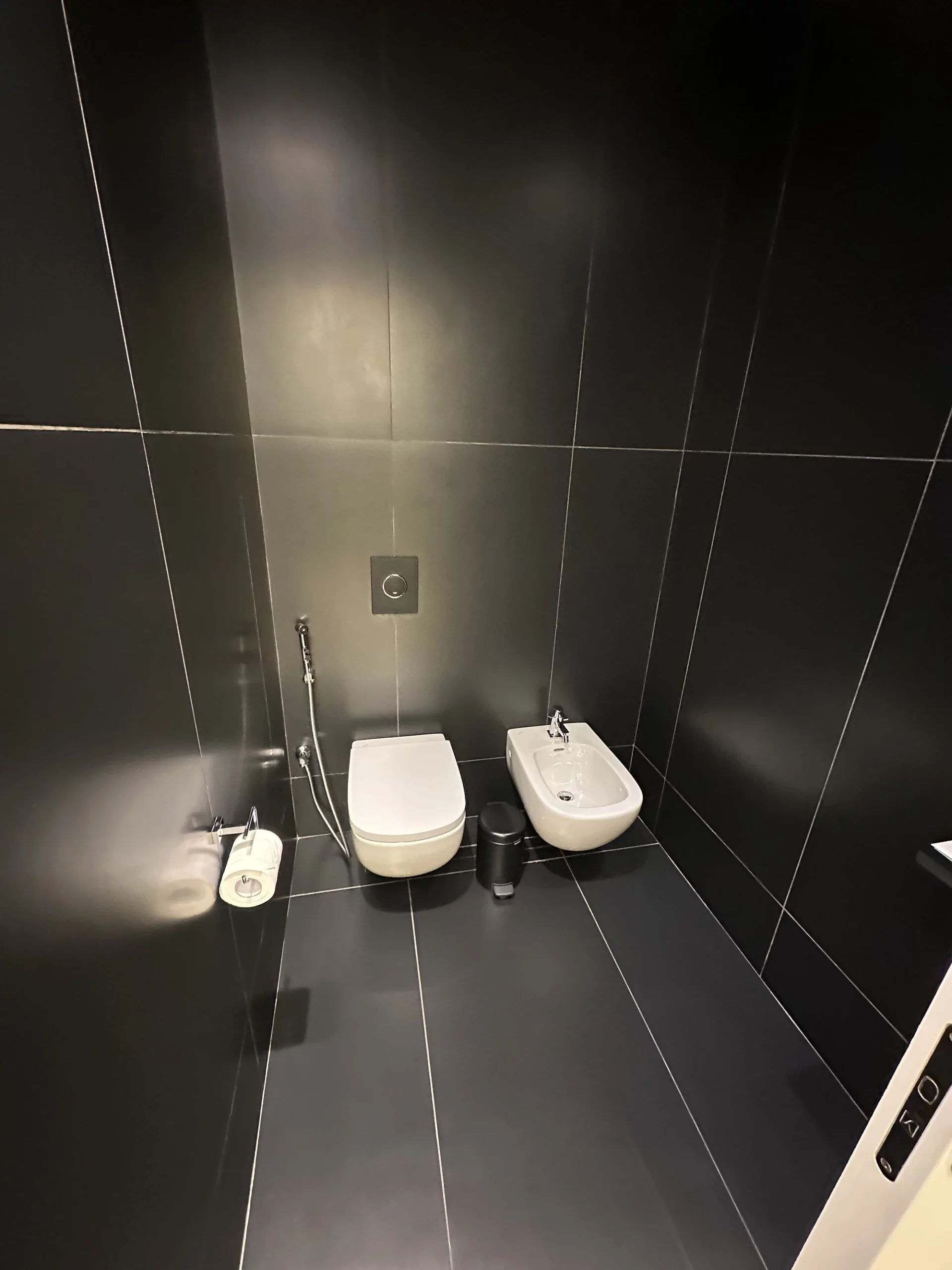The bathroom is split into three, with a separate toilet and bidet in a room with a full-height door. The rest of the bathroom is contained in a narrow strip along the side of the bedroom. The thin space starts with a large counter (with just one sink) and a large mirror.